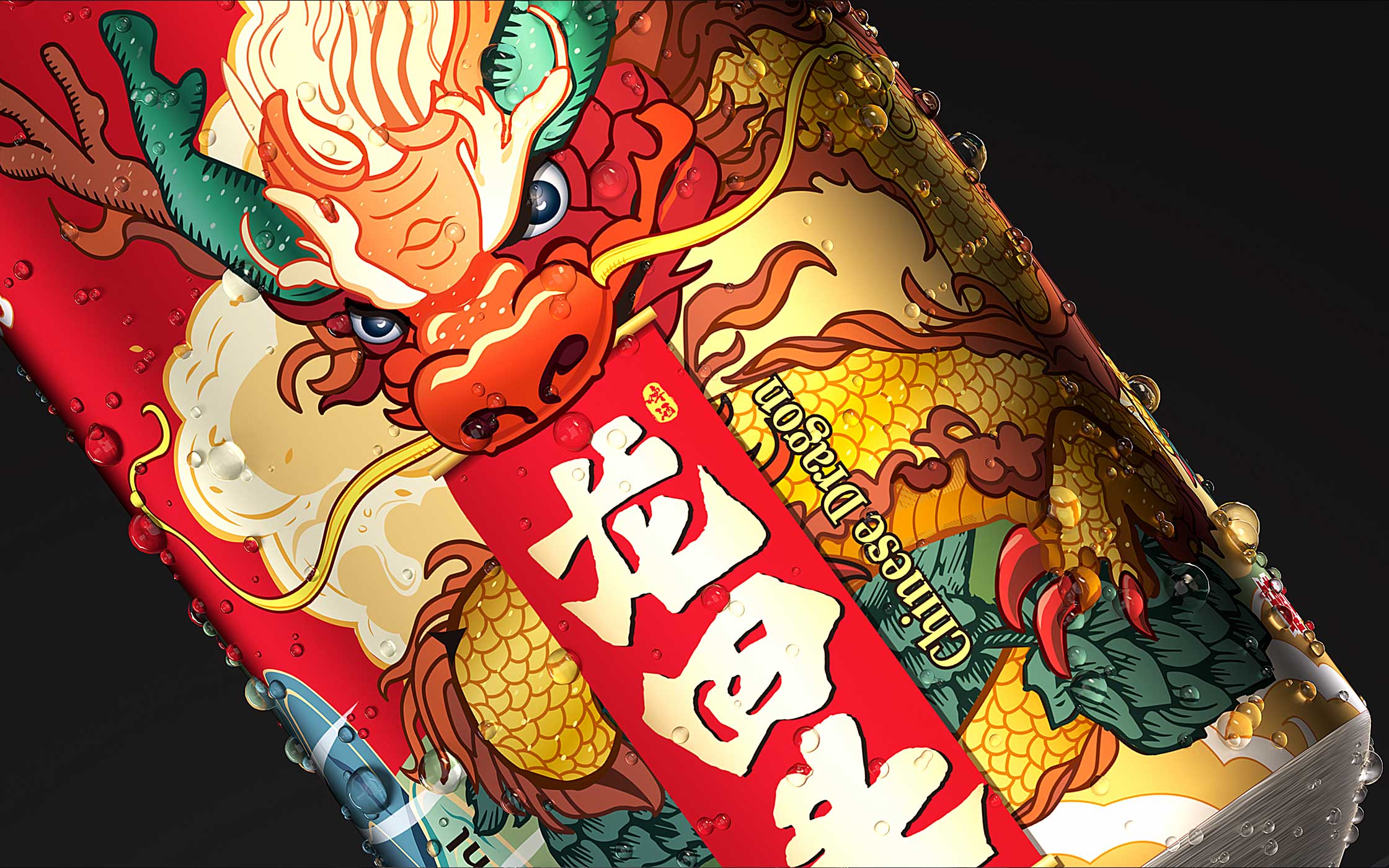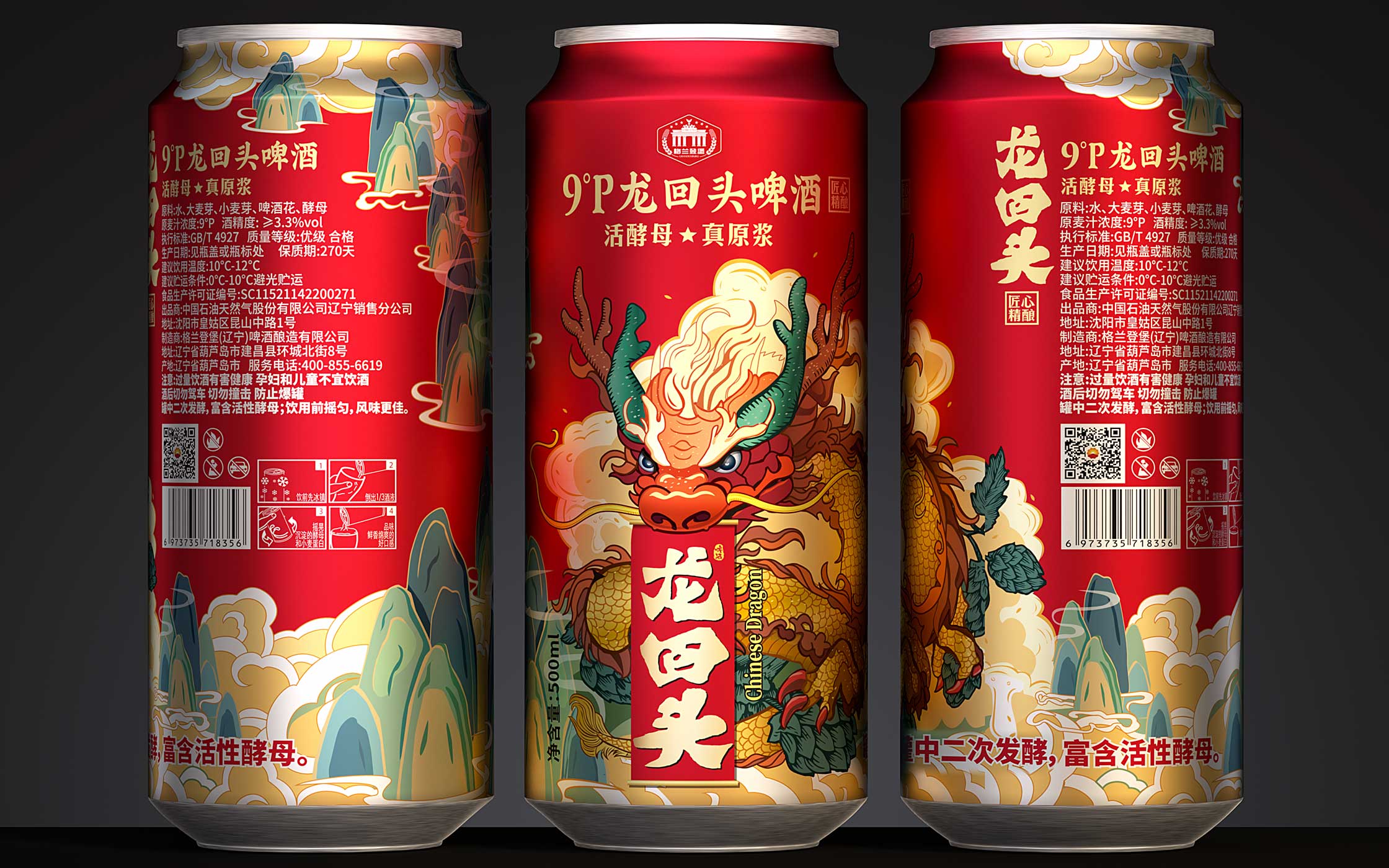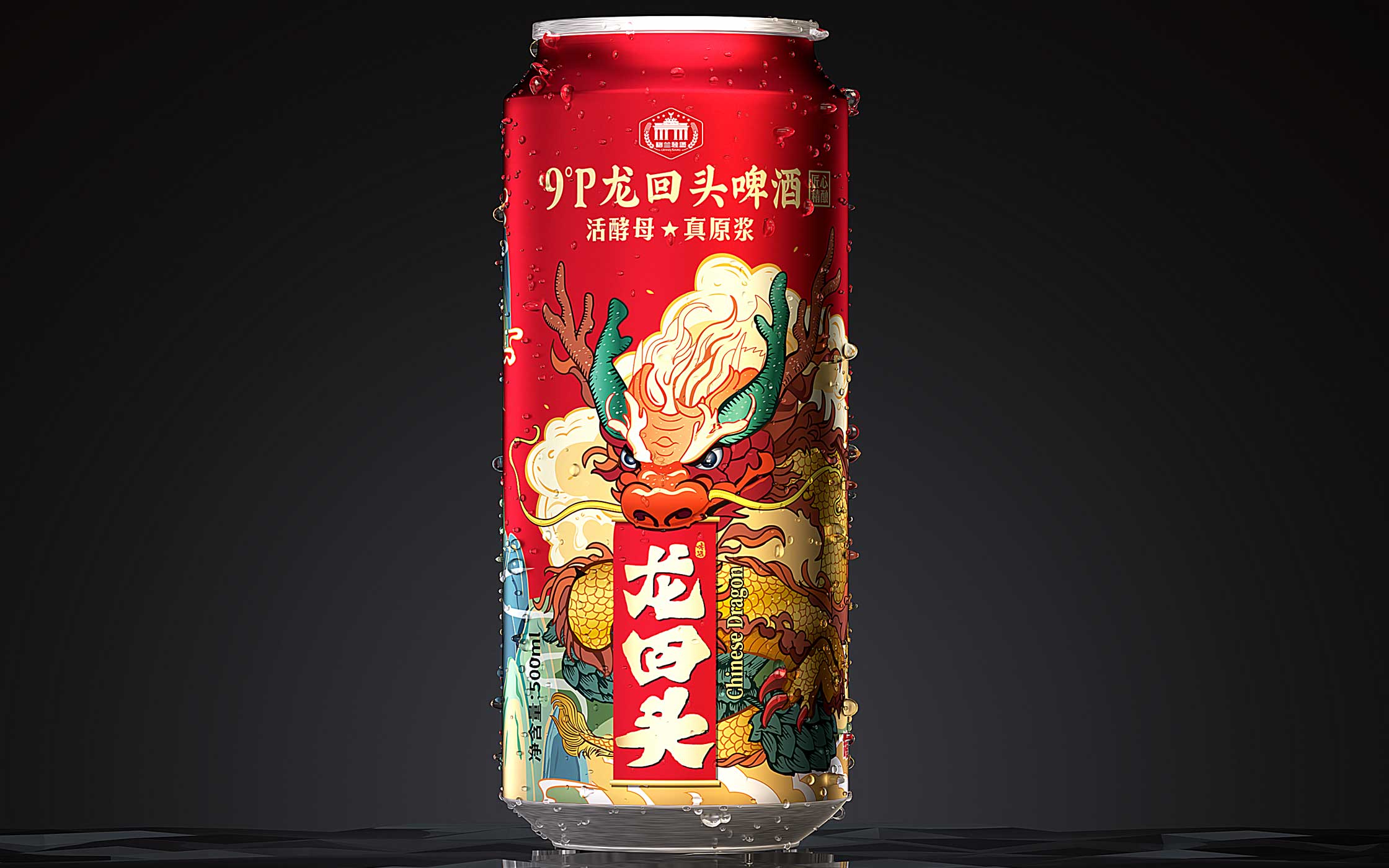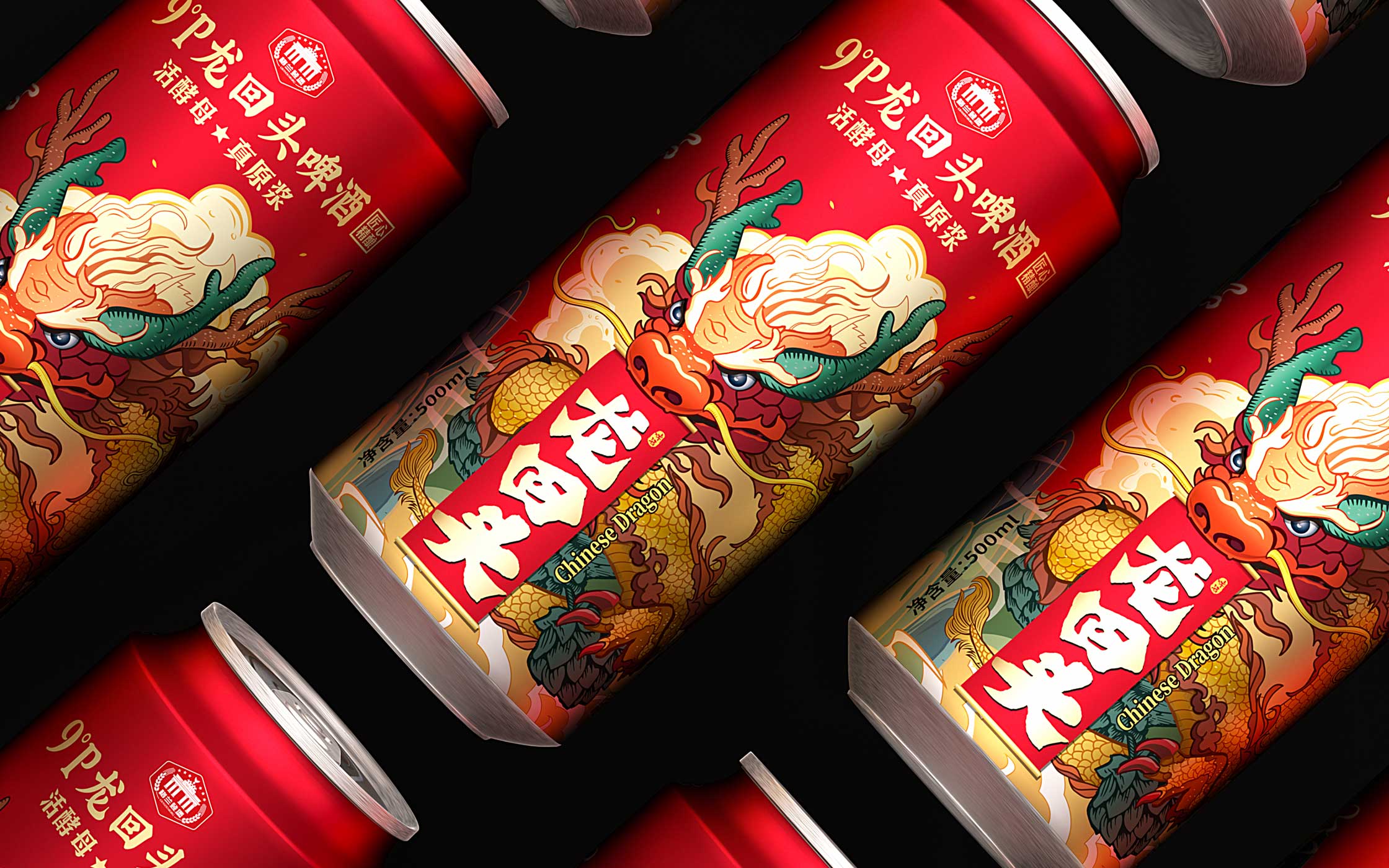 创作理念 / 龙回头窖藏小麦啤酒以国潮中国龙形象为符号,传递品牌“传统与活力并存”的调性。龙身融入金色麦浪纹理,象征高麦汁浓度的醇厚底蕴;龙须飘逸和云山环绕,暗喻二次发酵带来的绵密口感。整体设计兼具东方文化底蕴与现代精酿潮流,让消费者一眼识别“真原浆”的鲜活基因。